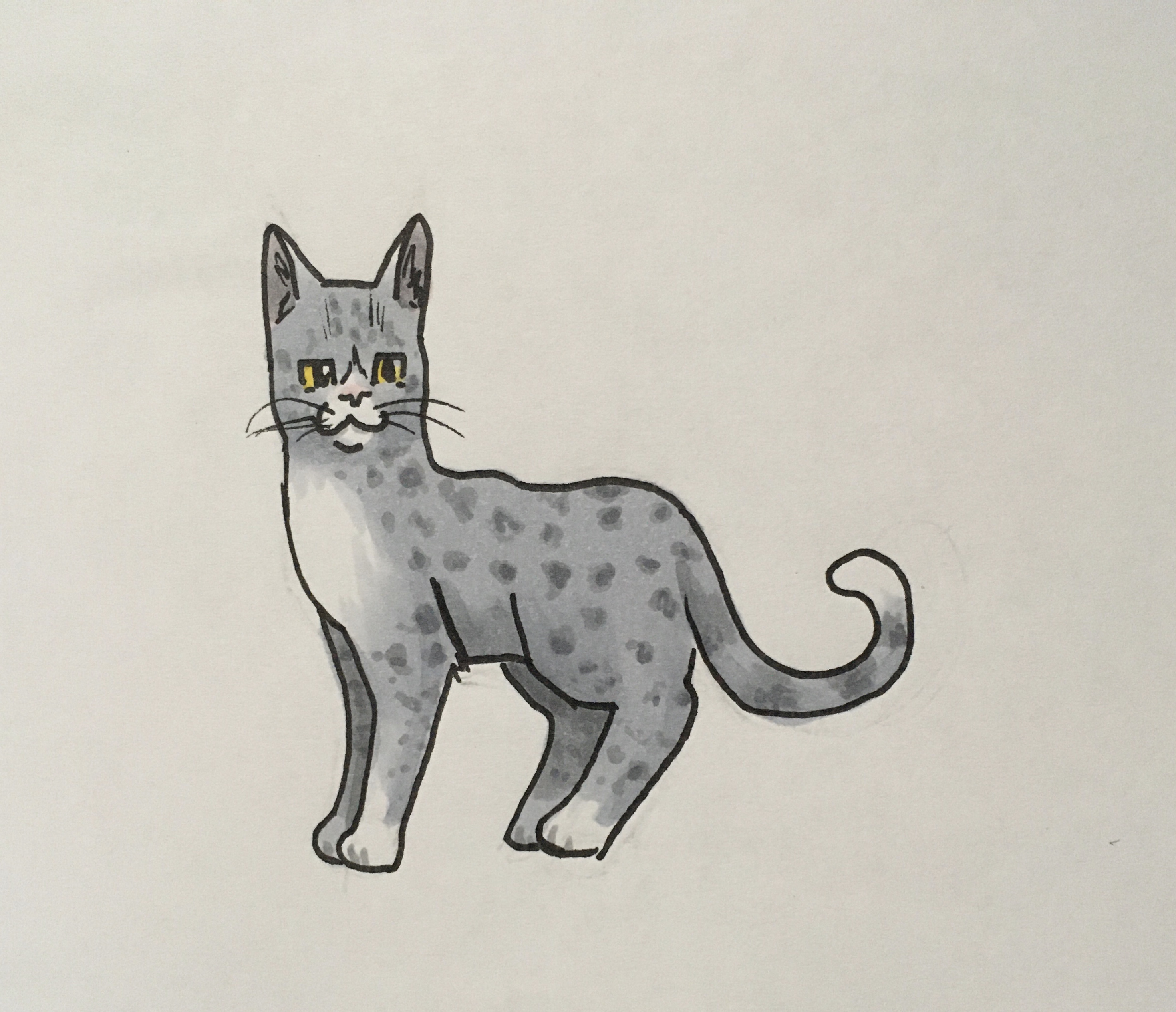 A gray spotted cat with yellow eyes standing. Date: July 19, 2023 Medium: Marker on paper. Description: A gray spotted cat with yellow eyes standing. Category: Cats