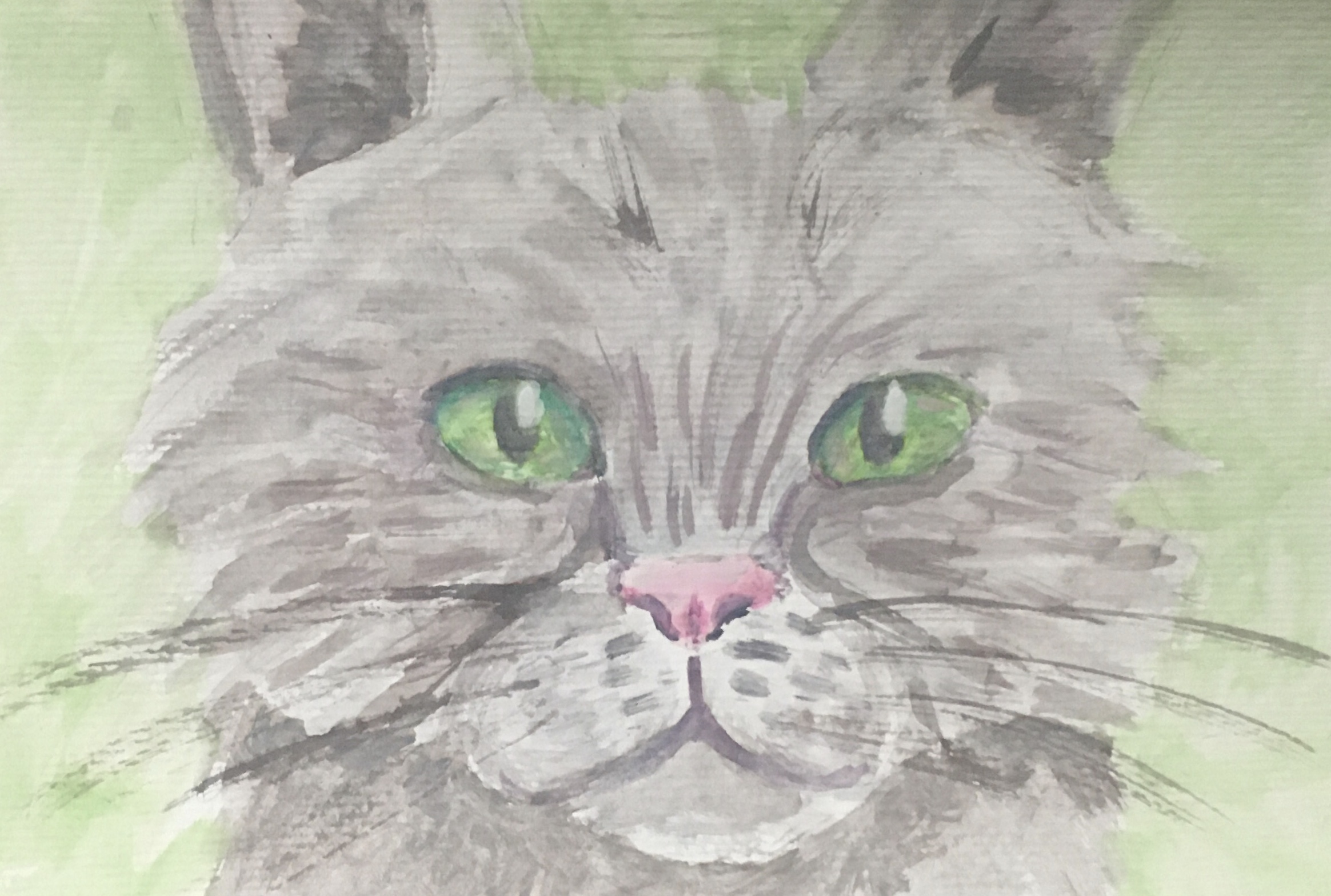 A light brown cat with green eyes on a green background. Date: May 25, 2023 Medium: Watercolor on paper. Description: A light brown cat with green eyes on a green background. Category: Cats