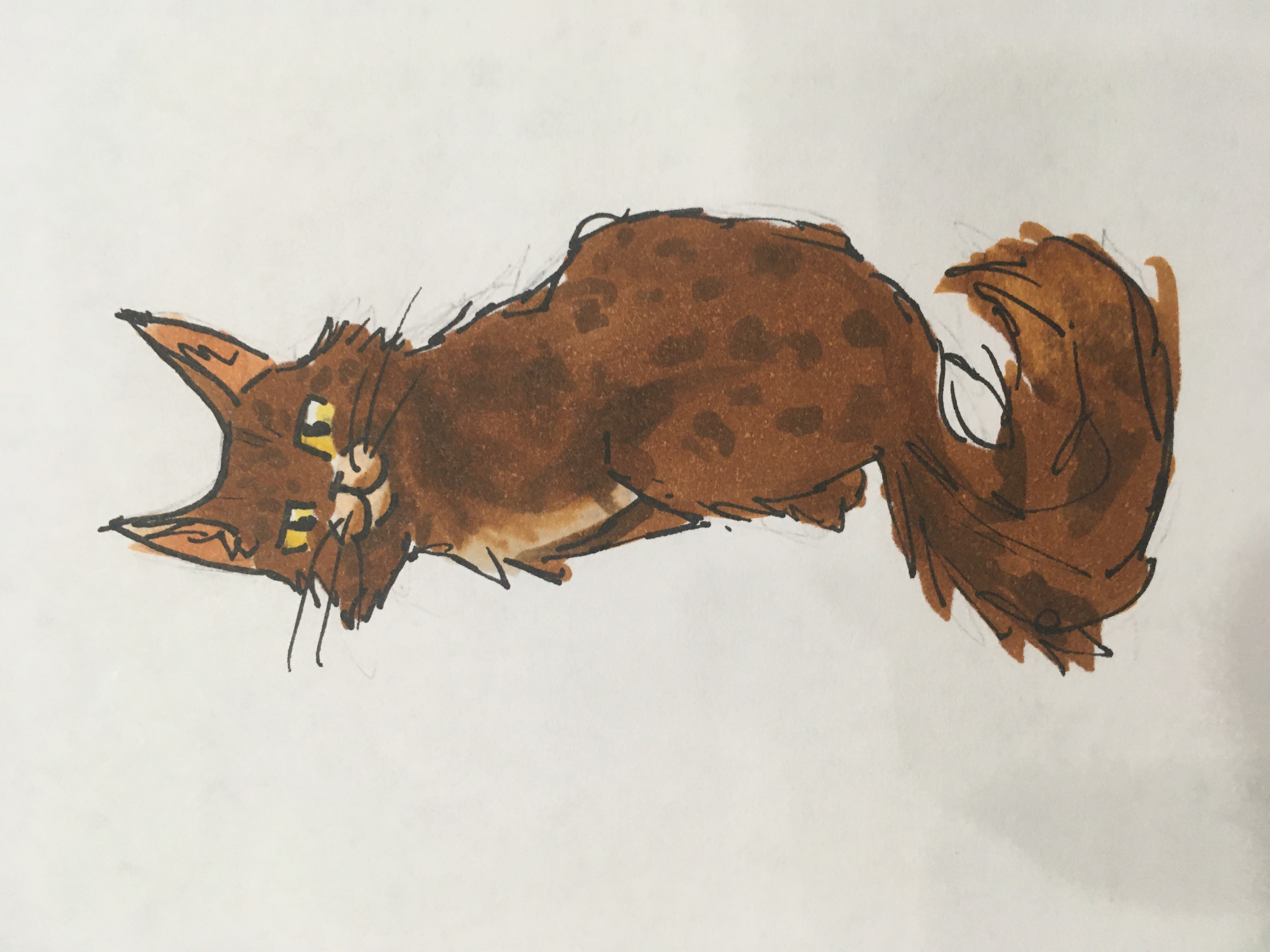 A spotted, fluffy brown cat sitting. Date: July 15, 2023 Medium: Marker on paper. Description: A spotted, fluffy brown cat sitting. Category: Cats