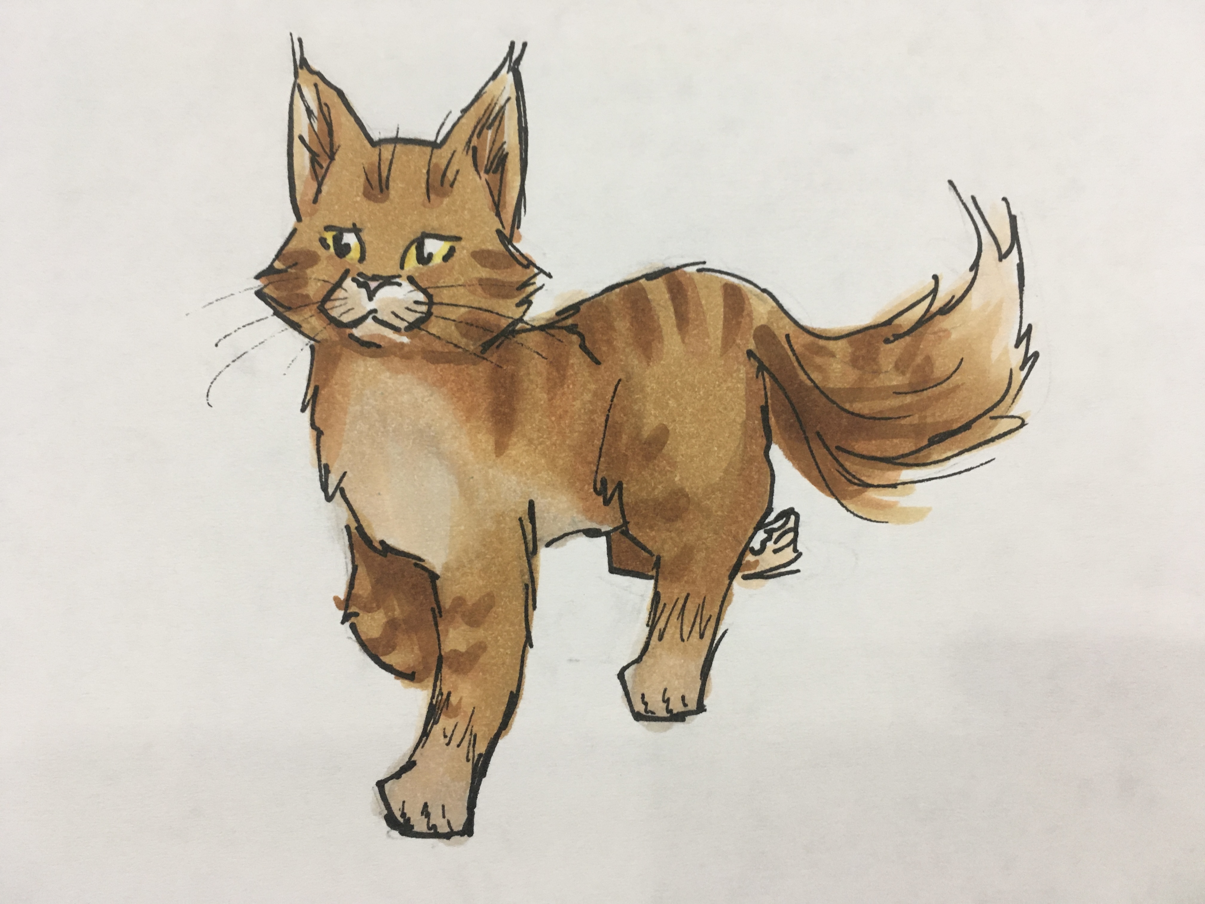 A striped, fluffy orange cat standing. Date: July 13, 2023 Medium: Marker on paper. Description: A striped, fluffy orange cat standing. Category: Cats