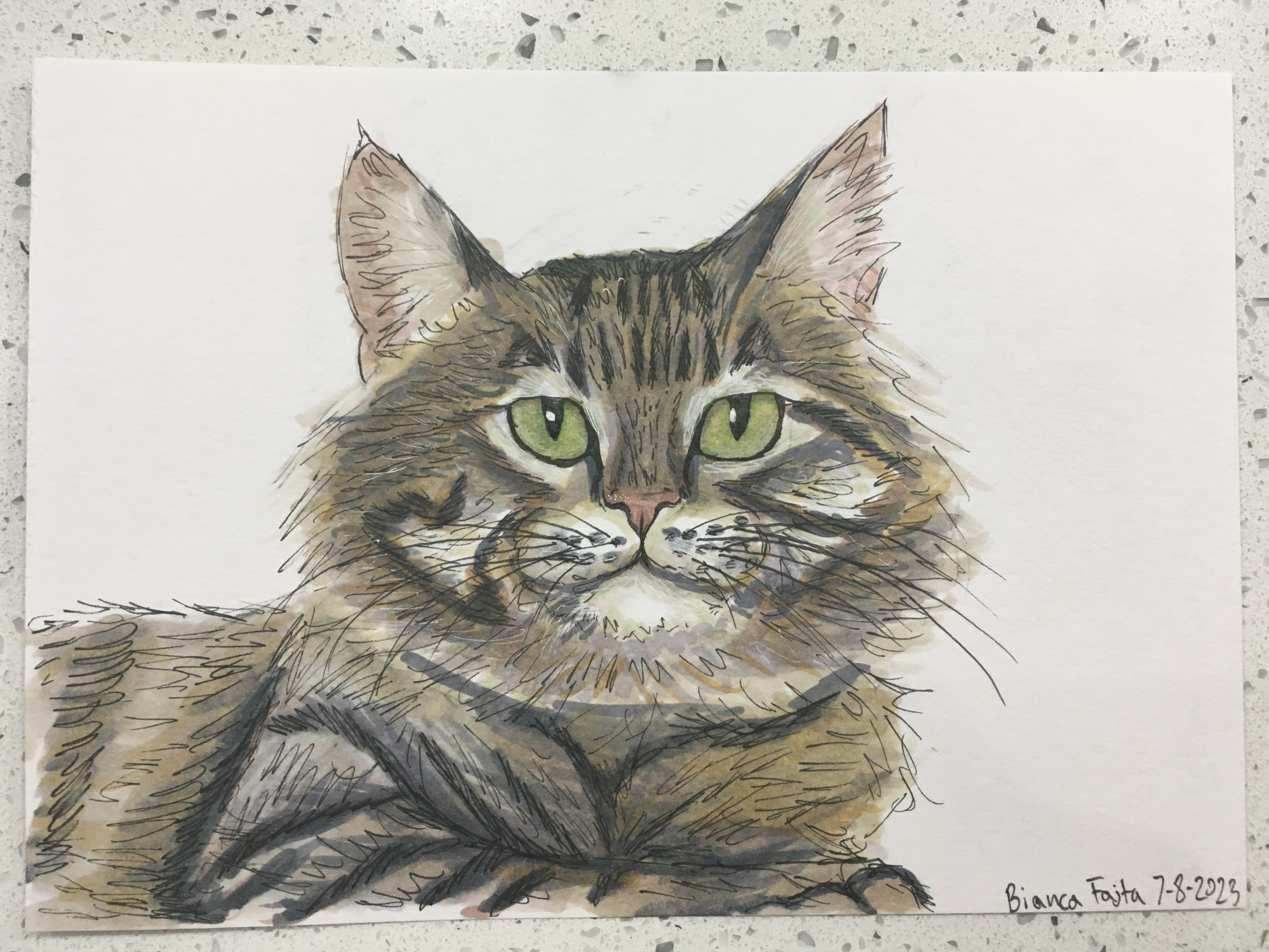 The front half of a fluffy striped cat. Date: July 8, 2023 Medium: Marker on paper. Description: The front half of a fluffy striped cat. Category: Cats